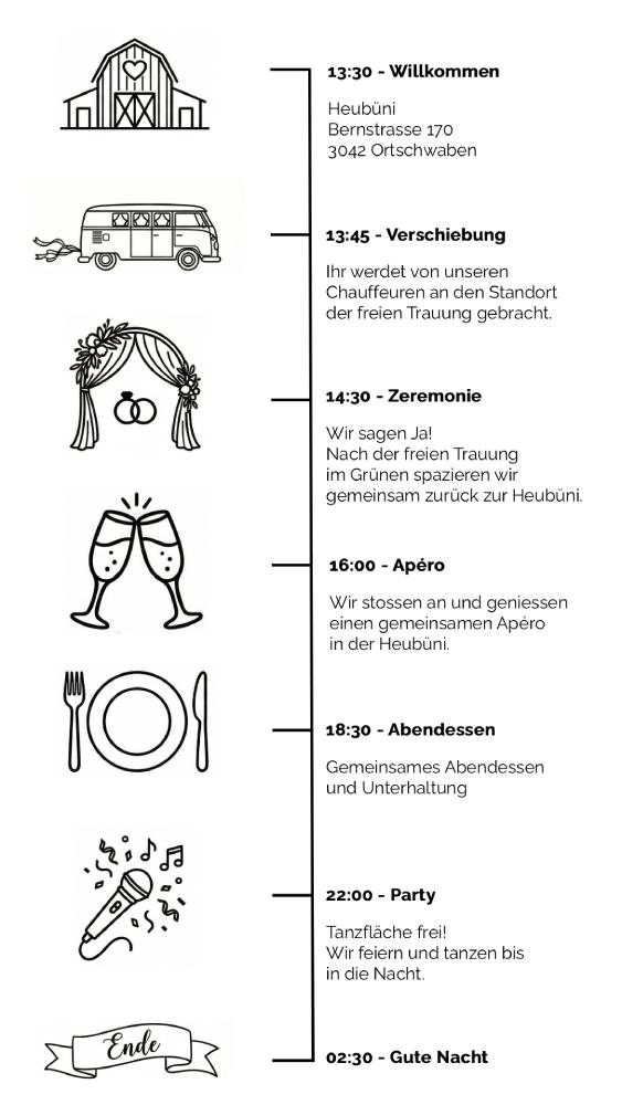 Dass ihr diesen Tag mit uns feiert, ist für uns das grösste Geschenk. Wenn ihr uns darüber hinaus eine Freude machen möchtet, sind wir dankbar für einen kleinen Zustupf in unsere Flitterwochen-Kasse.